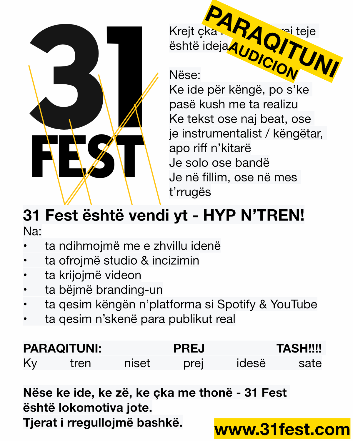 31 Fest (Treni Fest) organizohet nga OJQ Ne Shqip, një organizatë joqeveritare që punon për me shty përpara kulturën urbane dhe zërat e rinj në skenën lokale.